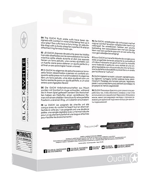 The OUCH! Plush ankle cuffs have been designed with comfort in mind while being tied up in your play! The cuffs have a furry lining, an adjustable strap with a sturdy clasp for a perfect fit and an attached ring for easy hook-ups.