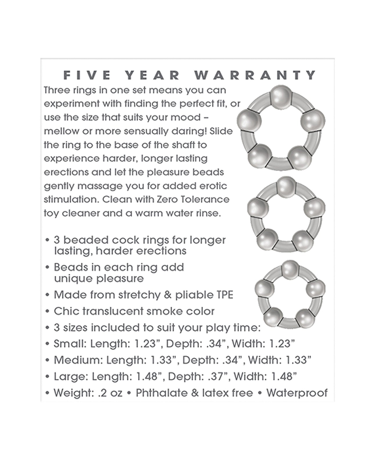 Experience extended pleasure and greater control with the Zero Tolerance Three Amigos beaded penis ring set. This versatile set includes three sizes, allowing you to discover the ideal fit for your needs while benefiting from uniquely stimulating pleasure beads for added sensation and support.